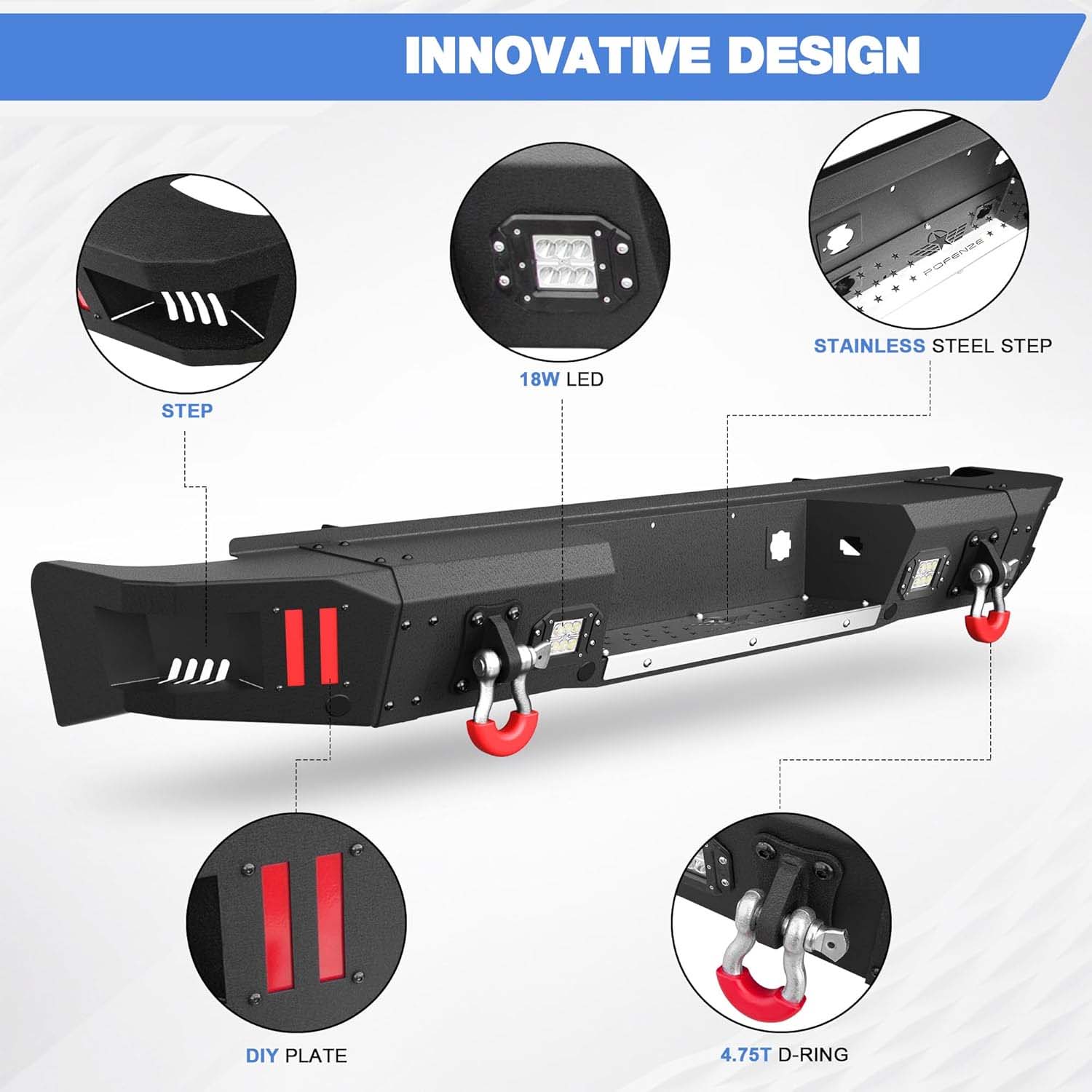 ✅Equipped with 2×18W high-intensity LED lights, this rear bumper increases rear-end visibility and adds a bold off-road aesthetic. Great for: